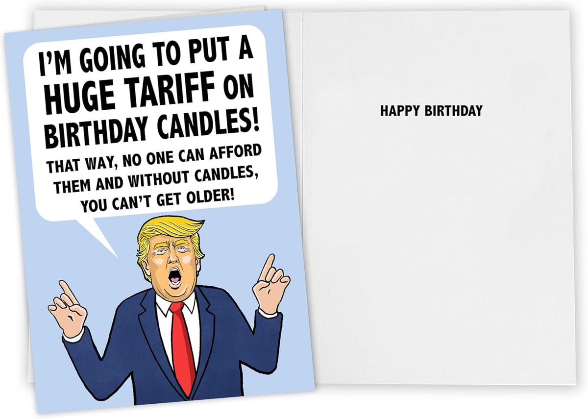 Add Funny President Donald Trump Tariff On Candles Birthday Card to your cart today and enjoy Free US Shipping.